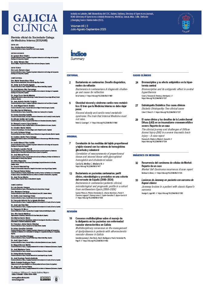 Galicia Clínica es la revista de la Sociedad Gallega de Medicina Interna. Su objetivo es dar a conocer a la comunidad científica, especialmente del ámbito sanitario, los trabajos de investigación realizados por los profesionales de especialidades médicas, promoviendo así la actividad investigadora, la formación sanitaria, el conocimiento mutuo y la colaboración entre profesionales.